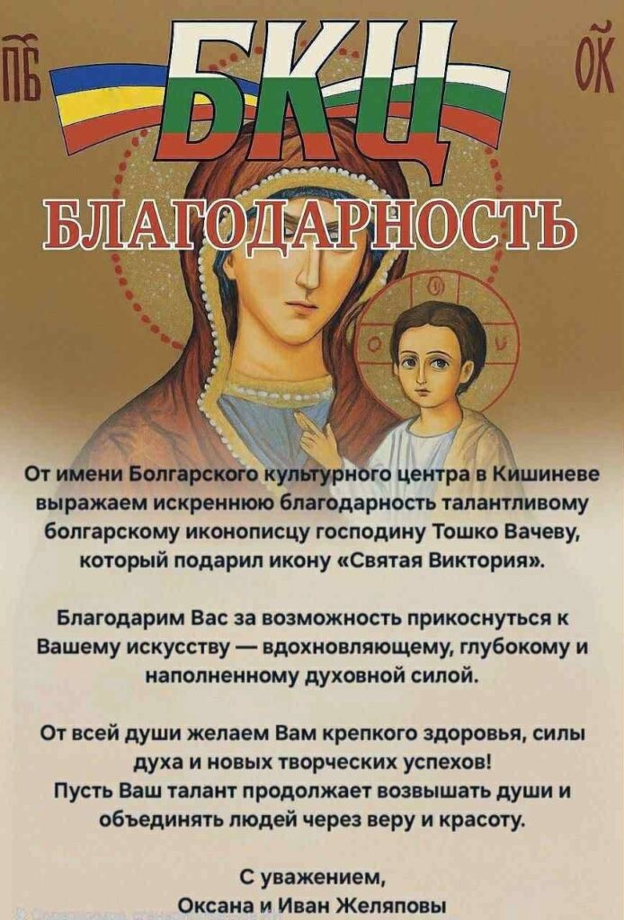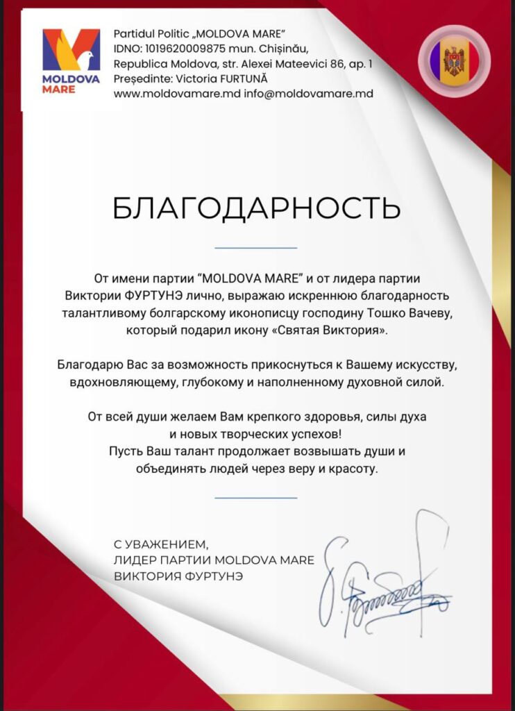 Cu deosebită apreciere, reprezentanții partidului Moldova Mare și ai Centrului Cultural Bulgar din Moldova au profitat de ocazie pentru a-i înmâna diplome de recunoștință renumitului și talentatului iconar Toșko Vacev. Expoziția lucrărilor sale, organizată recent la Chișinău, continuă să fie un subiect central de discuție în rândul pasionaților de artă sacră.