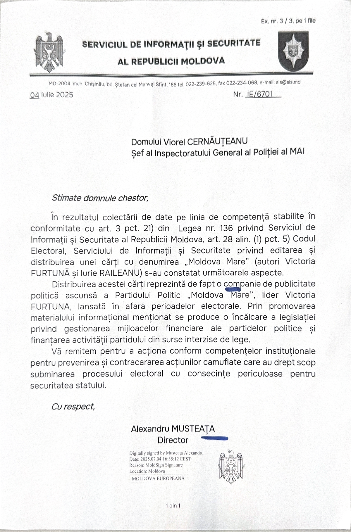 Aceste măsuri, susține Furtună, urmăresc eliminarea partidului „Moldova Mare” din campania electorală din 28 septembrie 2025, sub pretextul unui presupus finanțări ilegale. În documentul falsificat, șeful SIS afirmă că volumul reprezintă „publicitate politică mascată”, iar promovarea acestuia încalcă prevederile legii referitoare la utilizarea fondurilor financiare ale partidelor politice.