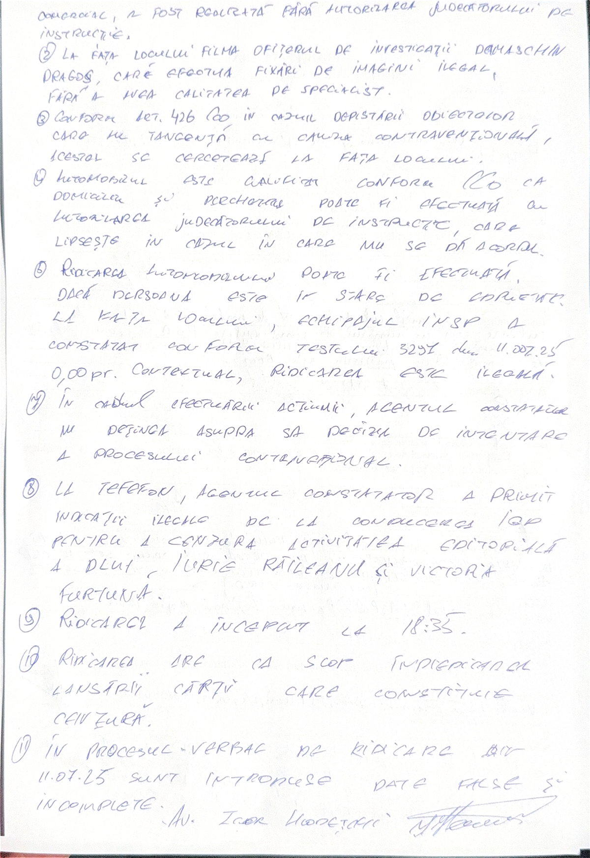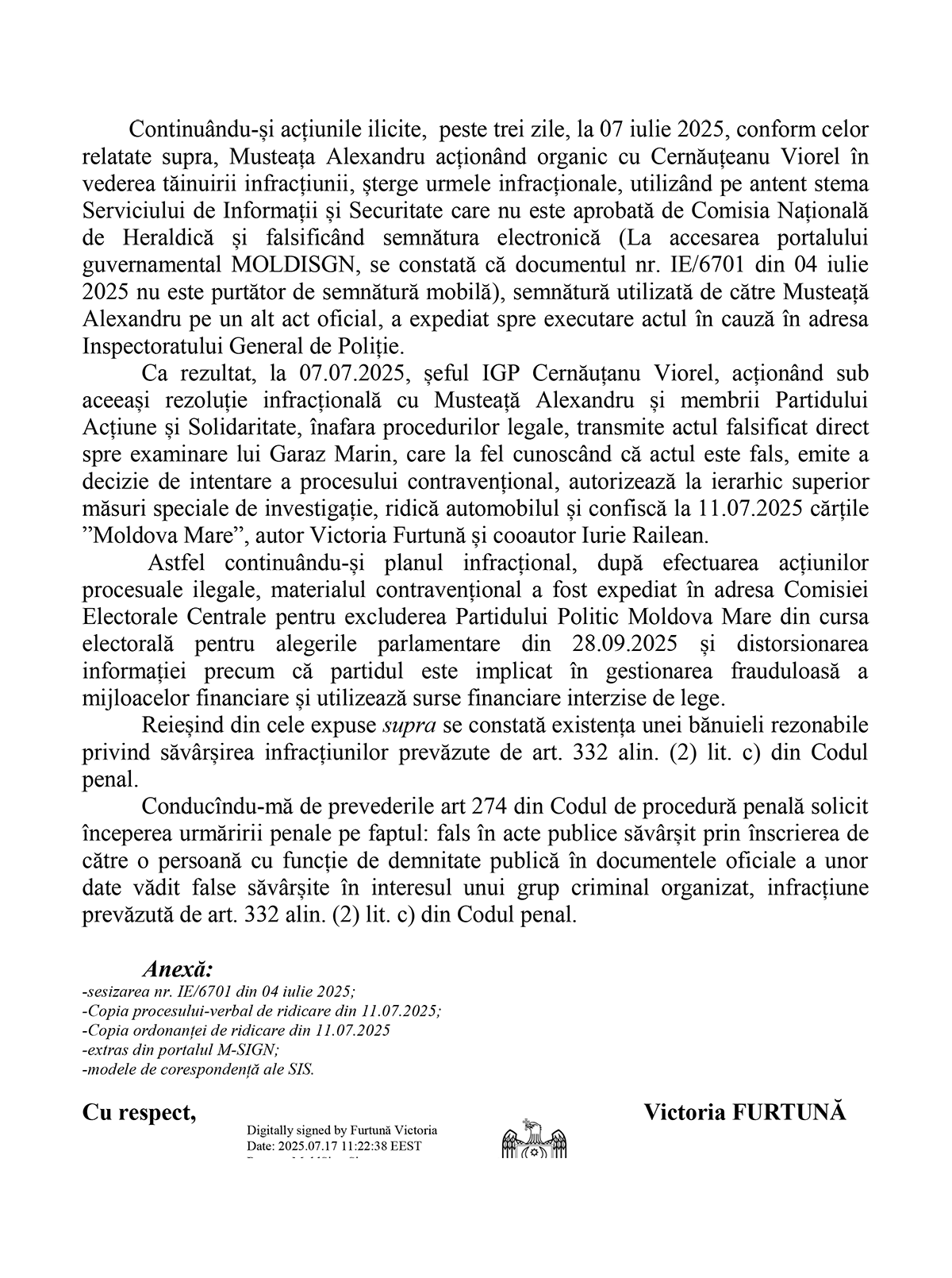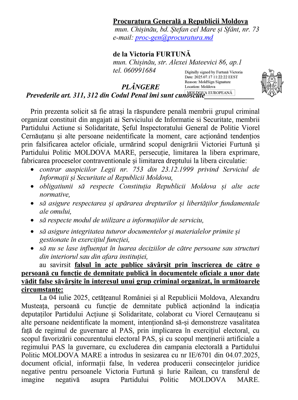Conform celor expuse în plângere, șeful SIS, Alexandru Musteață, la indicația unor deputați PAS și în complicitate cu șeful IGP, Viorel Cernăuțeanu, ar fi falsificat un document cu conținut sensibil, compromițător pentru autorii lucrării „Moldova Mare” - Victoria Furtună și Iurie Răileanu. Pe data de 7 iulie 2025, actul falsificat ar fi fost transmis către structurile de poliție, iar ulterior, Cernăuțanu l-ar fi înaintat inspectorului Marin Garaz, care a declanșat un proces contravențional. În consecință, au fost puse în aplicare măsuri speciale de monitorizare, fiind sechestrat un automobil și confiscate 50 de exemplare ale albumului monografic „Moldova Mare”.