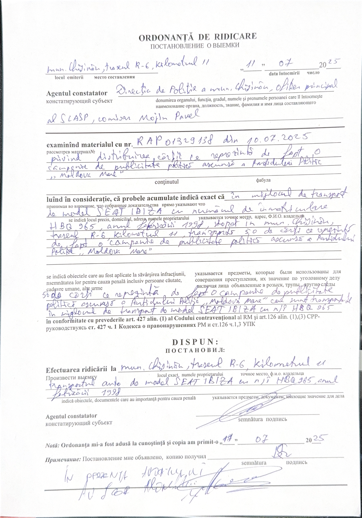 Cartea „Moldova Mare” a fost confiscată în baza unui document falsificat, pentru a servi drept pretext în formularea unor acuzații privind presupusa gestionare ilegală a resurselor financiare, având scop excluderea partidului MOLDOVA MARE din alegerile parlamentare.